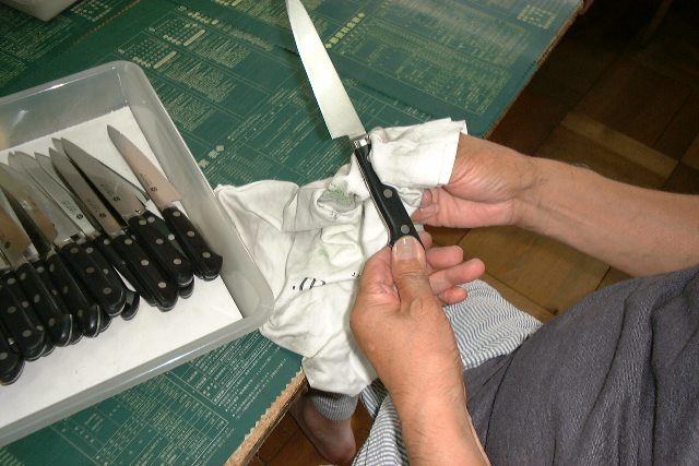 水研ぎ(刃肉取): 研削したものの刃になる部分をさらに薄く研削し鋭さをつける。